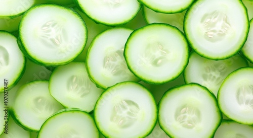 Freshly sliced cucumbers arranged neatly on a vibrant green backdrop, showcasing their crisp texture and refreshing appearance for a health-focused dish or salad preparation