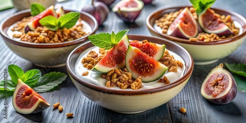 Freshly sliced figs arranged artfully atop a bowl of creamy high-protein yogurt, garnished with a sprinkle of granola and a few fresh mint leaves.