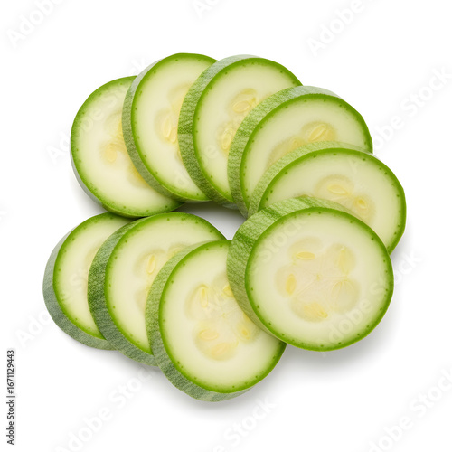 Freshly sliced green zucchini or courgette arranged in an overlapping circular pattern, isolated on a white background.
