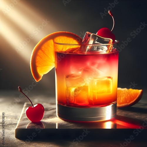 Freshly squeezed orange juice. This famous cocktail , old fashioned cocktail. Glass of cognac, made by AI, It is served unmixed, resulting in rainbow layers in the glass, hence the name.