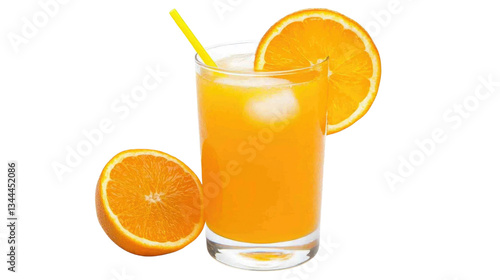 Freshly Squeezed Orange Juice in a Glass with Orange Slice and Straw on a White Background