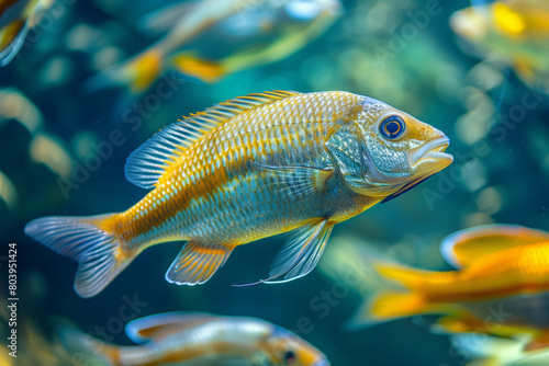 Freshwater fish swim underwater. By looking from the side.