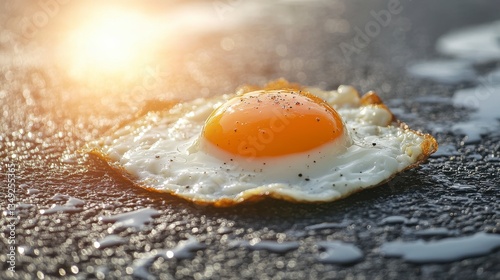 Fried Egg with Runny Yolk on Dark Wet Surface Backlit by Sunlight