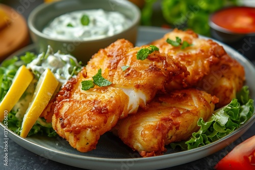 Fried fish spicy battered fish fillets served with mint sauce and crispy salad