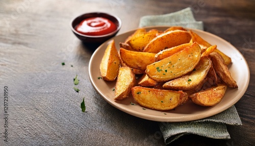 Fried potato wedges served with ketchup
