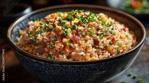 Fried rice vegetables scrambled eggs and soy sauce served in a traditional Chinese bowl Popular Chinese dish