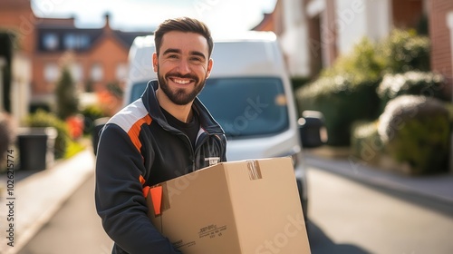 Friendly delivery man smiling at the camera with a cardboard box, delivery van parked behind him, sunny day, urban environment, business concept