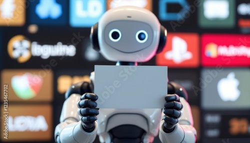 Friendly robot holding blank sign in front of colorful background