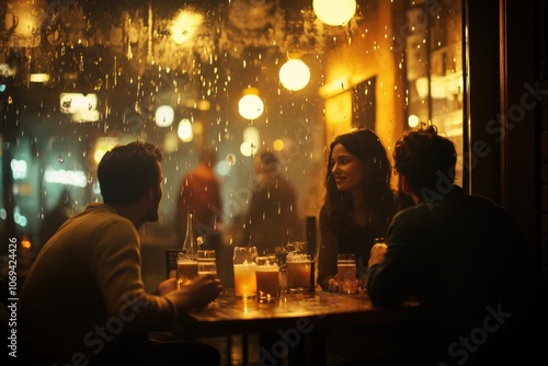 Friends drinking beer in a pub on a rainy night