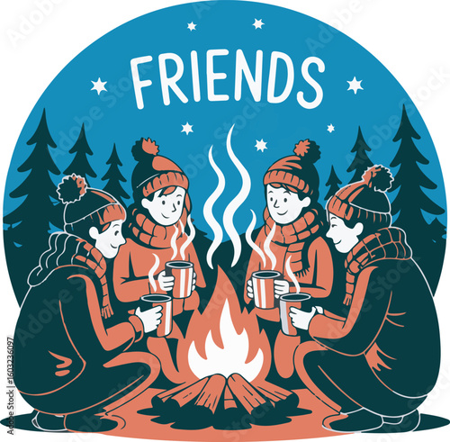Friends Gathered Around Campfire A Cozy Outdoor Scene with Warm Drinks and Companionship
