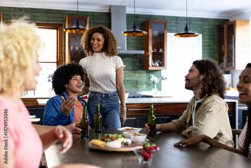 Friends sharing laughter and stories around kitchen table with drinks and conversation