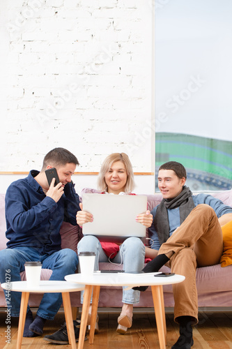 Friends sit on the couch, chatting and using a smartphone, desktop computer, laptop.