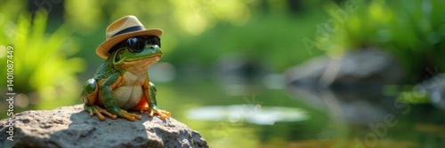 Frog with sunglasses and hat on a rock near a pond, rock, sunglasses