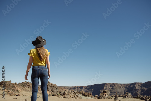 From below woman standing against blue cloudless sky and dry mountains