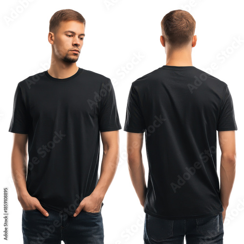 Front and Back: A man is posing in front view and back view. he is wearing a simple black t-shirt and jeans.