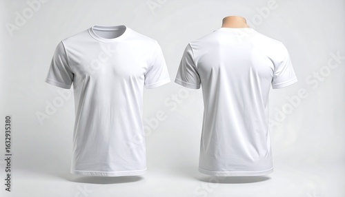 Front and back view of a plain white t-shirt on a neutral background. Apparel mockup for design.