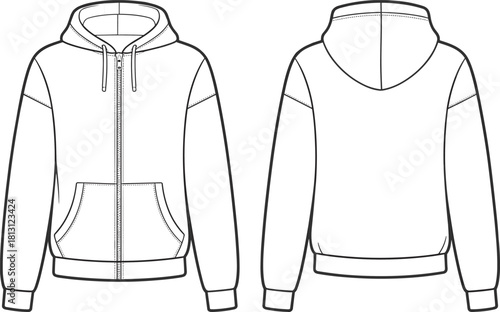 Front and back zip up hoodie technical flat sketch with detailed stitching, kangaroo pocket design, CAD fashion illustration template