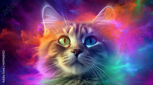 Front face of a cat completely made up of colorful smoke, universe background. IA generative.