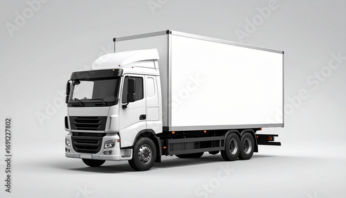 Front view of a large white box truck with enclosed cargo area, dual rear axles, modern grille, and side mirrors, positioned in a neutral studio setting.
