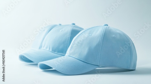 Front view of light blue baseball caps mockup on white background, with space for your logo or design. Mock-up for branding