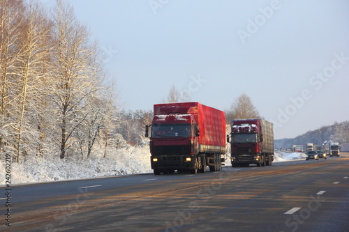 Front view red trucks on European winter road - four lane asphalt highway on snowy trees and blue sky background