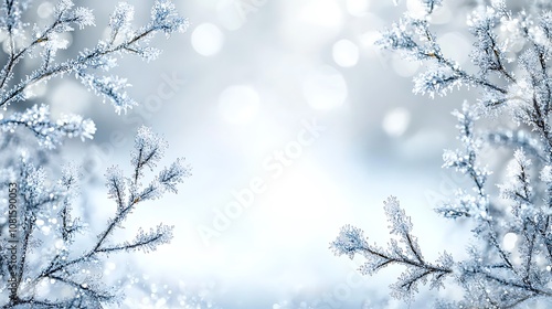 Frost-covered branches and shimmering icicles create a winter-themed border, framing a central white space, soft snowflakes in the background, cold light reflections, hd quality. --ar 16:9
