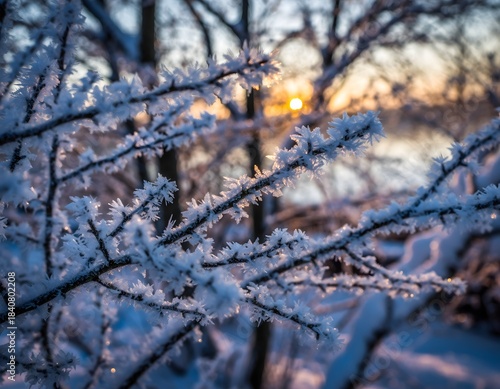 Frost-Covered Winter Branches Close-Up with Sparkling Bokeh Lights and Icy Seasonal Details