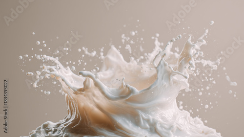 Frozen splash of milk or cream swirling and splashing upward in mid-air with detailed droplets against a beige background for dairy, freshness, or fluidity concepts