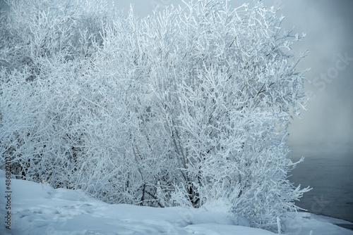 Frozen tree branches covered with white snow. Beautiful winter wonders of nature. Winter background