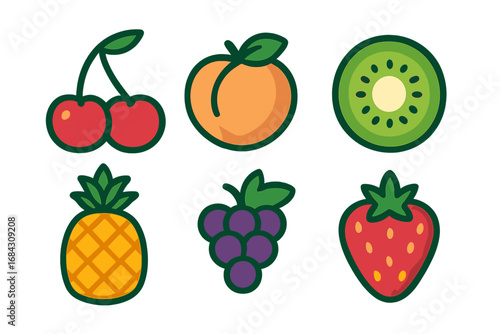 Fruit icon set. Colorful minimalist vector cartoon illustration of cherry, peach, kiwi, pineapple, grape, strawberry. Healthy fresh food concept for diet, juice, or grocery.
