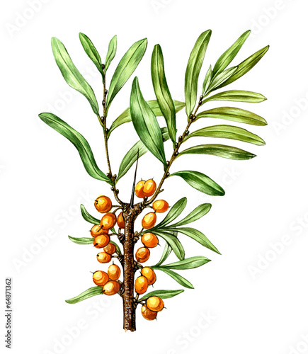 Fruits and leaves of sea buckthorn (Hippophae). Botany
