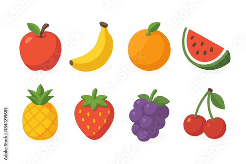 Fruits flat icon set. featuring apple, banana, orange, watermelon, pineapple, strawberry, grape, cherry