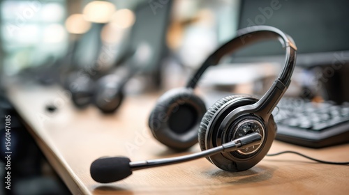 Frustrated customers service complaint concept. Headset on a desk in a modern office environment with computers in the background.