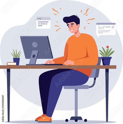 Frustrated man working at a desk with a computer in a flat vector illustration depicting stress and focus in a modern workspace