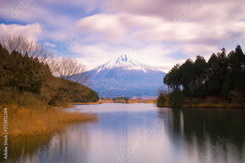 Fuji mountains with lake in foreground and cloud flow