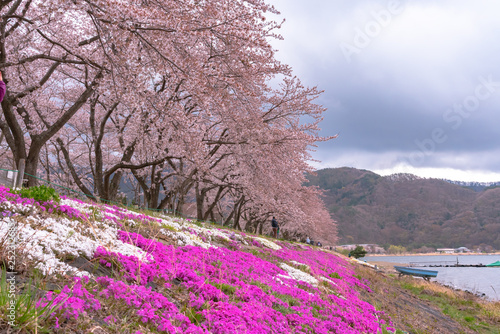 Fujikawaguchiko Cherry Blossoms Festival. View of full bloom pink cherry trees flowers at Lake Kawaguchi with clear blue sky natural background in springtime sunny day. Yamanashi Prefecture, Japan