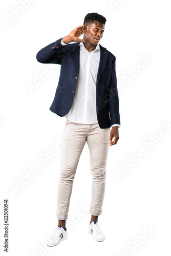 Full body of Handsome african american man wearing a jacket listening to something by putting hand on the ear on white background