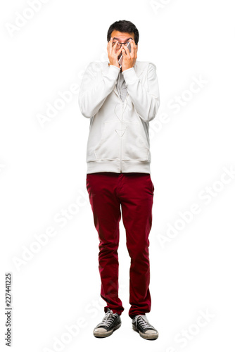 Full body of Man with glasses and listening music surprised and covering face with hands while looking through fingers on white background