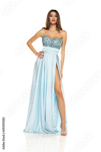 Full length of gorgeous elegant sensual brunette woman wearing fashion blue evening dress isolated on white background