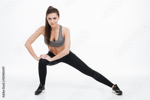 Full length portrait of a happy sporty woman stretching leg