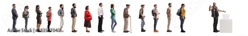 Full length portrait of a punk man voting and showing a thumb up and a line of people waiting