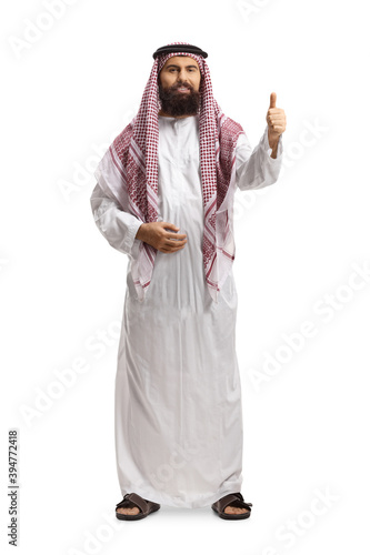 Full length portrait of a saudi arab man wearing a traditional thobe and gesturing a thumb up sign