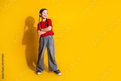 Full length portrait of cute little girl crossed arms look empty space wear t-shirt isolated on yellow color background