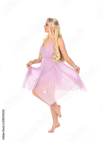 full length portrait of pretty blonde girl wearing purple fairy dress. standing pose, isolated on white studio background.