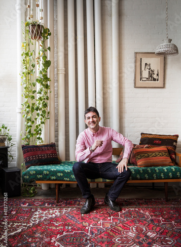 Full length portrait of smiling man sitting on chaise longue at home