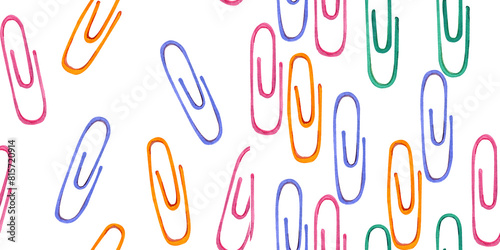 Fun color paper clips set. Set of watercolor seamless pattern. Illustration of school supplies. Green, violet, pink and orange. Hand drawn isolated on transparent.