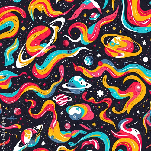 Fun Funky Space and Planets Pattern Wallpaper, Wild Science Fiction Wrapping Paper Design, Retro Stars Astronomy Background Concept, Colorful Vibrant Galactic Galaxy Backdrop