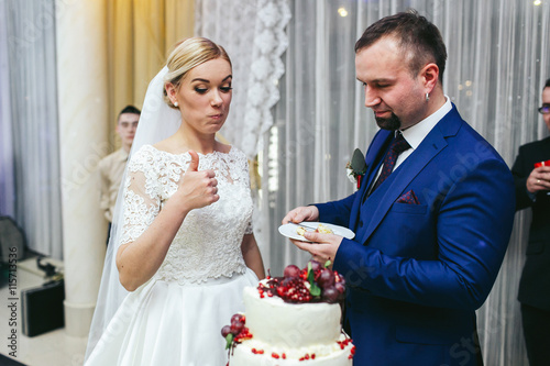Funny bride rises her thumb up after she tasted a wedding cake