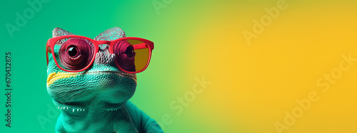 Funny colorful chameleon with sunglasses, isolated on bright colour background