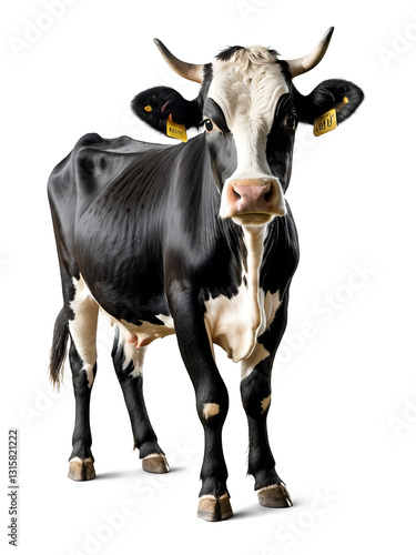 Funny cute cow isolated on white. Talking black and white cow. Funny curious cow. Farm animals. Cow, standing full-length in front of white background, Pet cow on white.